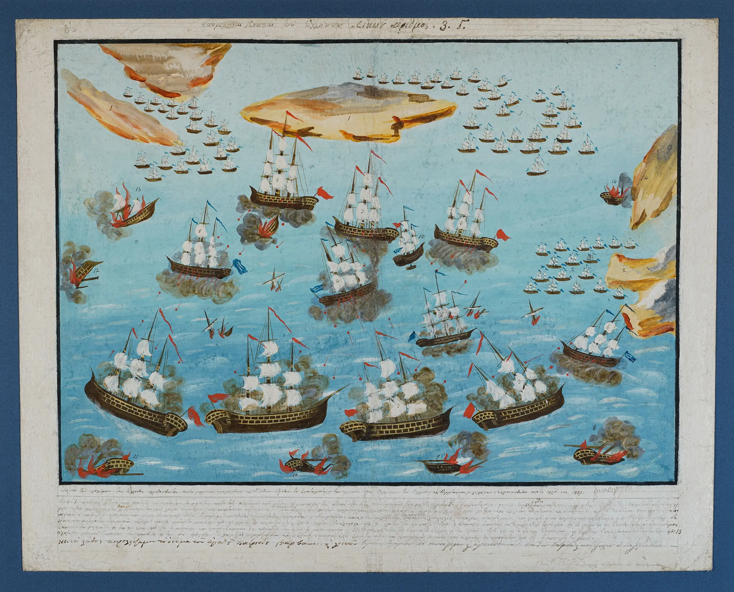 Ο πίνακας “Ναυμαχίαι Γενικαί των Ελλήνων” του Παναγιώτη Ζωγράφου, υπό την καθοδήγηση του Ιωάννη Μακρυγιάννη, ανήκει στη συλλογή ιστορικών απεικονίσεων της Ελληνικής Επανάστασης του 1821.
