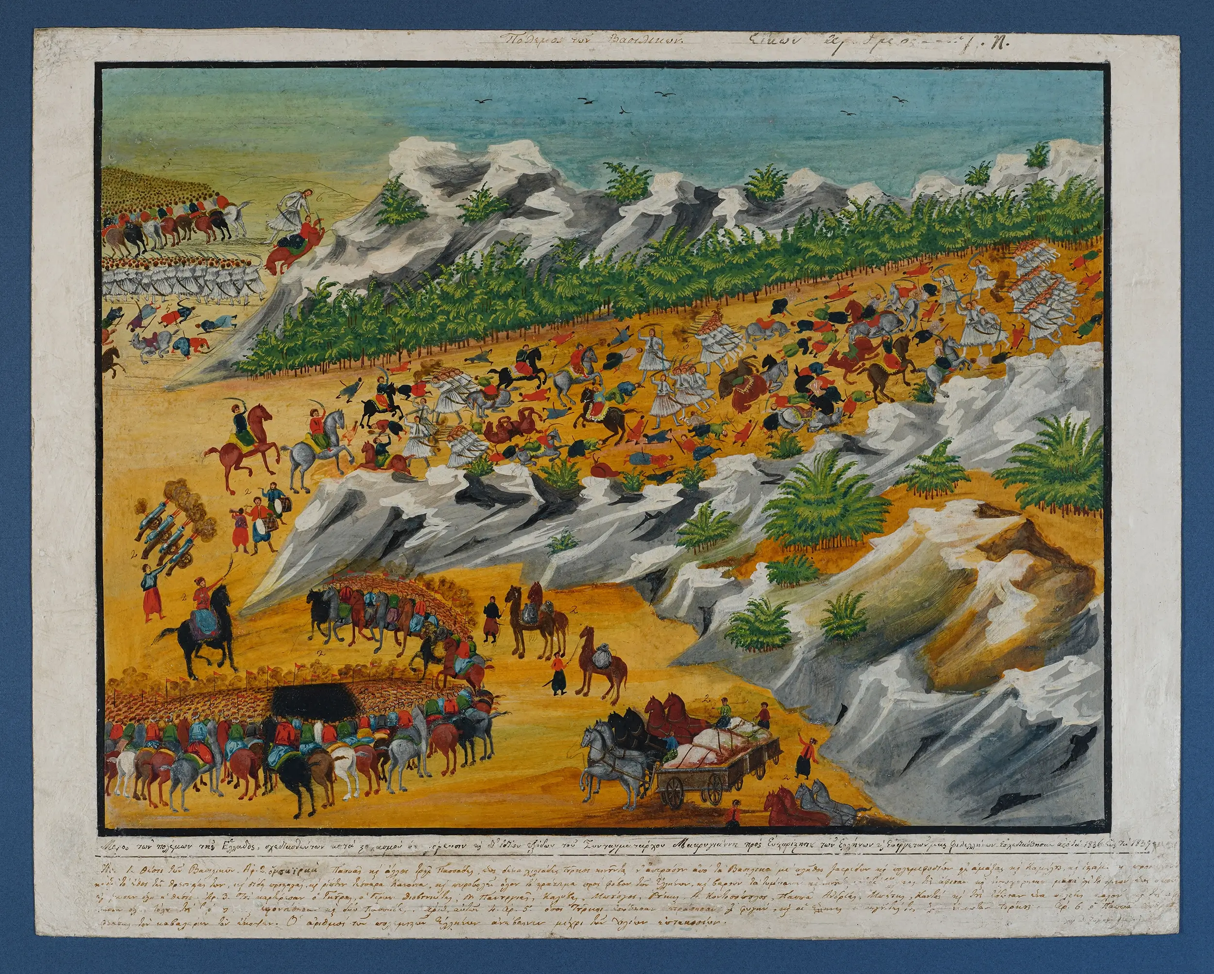 Η εικόνα αποδίδει τη σύγχυση της πολεμικής αναμέτρησης, το θρίαμβο των Ελλήνων και τους πανικόβλητους Οθωμανούς. Ούτε ένας φουστανελοφόρος δεν κείται στο πεδίο της μάχης, το οποίο είναι γεμάτο από νεκρά σώματα αντιπάλων. Ιδιαίτερη σημασία δίνεται στο τοπίο με τους ορεινούς όγκους στις δύο πλευρές της κοιλάδας και το καταπράσινο δάσος.