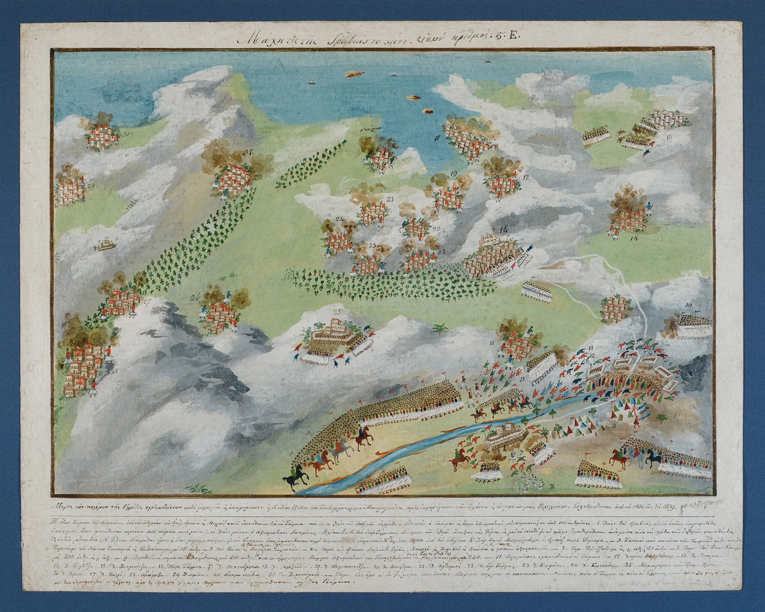 The fifth image describes the battles of Gravia (8 May 1821) and Ampliani (14 July 1824), as well as minor skirmishes between Greeks and Ottomans in various villages in the area. After the Alamana, Odysseus Androutsos closed himself in the Gravia inn with 120 men. The vanguard of the Pasha of Beratio Omer Vryonis fell upon Androutsos, who withstood four attacks with minimal losses. While the Pasha was waiting for reinforcements with cannons, Odysseus cleared the inn and escaped. In July 1824, Panourgias managed to stop a large Turkish army of 15,000 men from his fortified position in Ampliani, between Gravia and Salona.